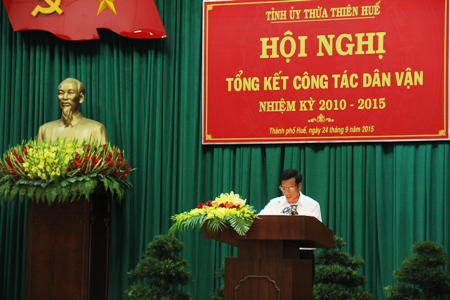 Kính thưa đồng chí Ngô Thị Doãn Thanh - Ủy viên Trung ương Đảng, Phó Trưởng Ban Dân vận Trung ương; Thưa các đồng chí đại biểu và toàn thể Hội nghị! Hôm nay, Ban Thường vụ Tỉnh ủy tổ chức Hội nghị tổng kết công tác dân vận nhiệm kỳ 2010 ...