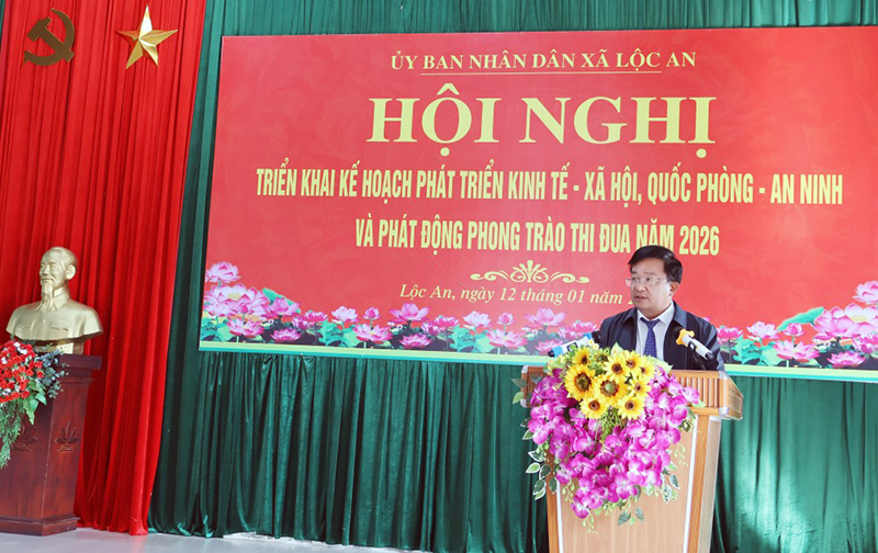 Sáng 12/01, UBND xã Lộc An tổ chức Hội nghị triển khai Kế hoạch phát triển kinh tế – xã hội, quốc phòng – an ninh và phát động thi đua năm 2026. Tham dự hội nghị có đồng chí Nguyễn Ngọc Anh - Bí thư Đảng ủy, Chủ tịch HĐND xã; đồng chí Nguyễn Thành Nhơn – Phó Bí thư Thường trực Đảng ủy; đồng chí Võ Đại Thắng - Phó Bí thư Đảng ủy, Chủ tịch UBND xã.