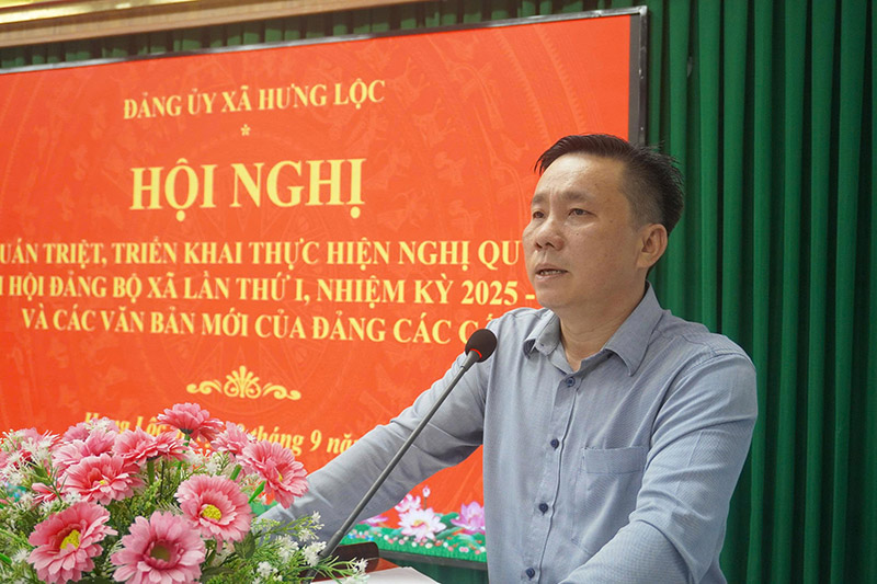 Sáng 18/9, Đảng ủy xã Hưng Lộc tổ chức hội nghị quán triệt, triển khai thực hiện Nghị quyết Đại hội đảng bộ xã lần thứ I, nhiệm kỳ 2025 - 2030 và các văn bản mới của Đảng các cấp. Đồng chí Trần Đình Vui - Bí thư Đảng ủy dự và phát biểu. ...