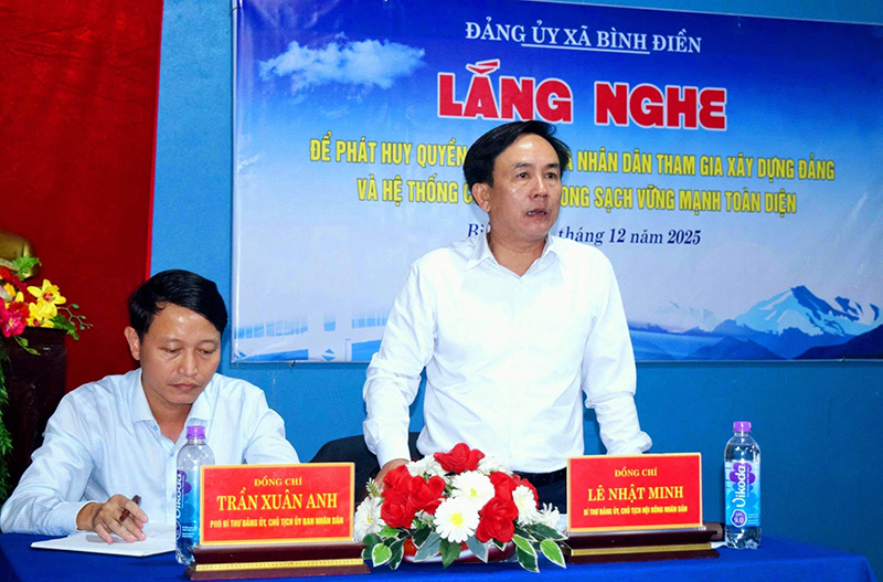 Ngày 22/12/2025, tại Nhà sinh hoạt cộng đồng thôn Đông Hòa, Thường trực Đảng ủy xã Bình Điền tổ chức buổi tiếp xúc, lắng nghe và đối thoại trực tiếp với Nhân dân thôn Đông Hòa. Buổi lắng nghe do đồng chí Lê Nhật Minh – Bí thư Đảng ủy, Chủ tịch HĐND xã và đồng chí Trần Xuân Anh – Phó Bí thư Đảng ủy, Chủ tịch UBND xã đồng chủ trì. Tham dự buổi đối thoại có các đồng chí trong Ban Thường vụ Đảng ủy xã; đại diện ...
