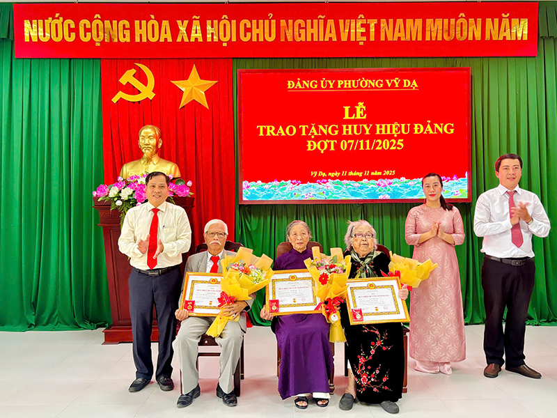 Ngày 11/11, Đảng ủy phường Vỹ Dạ tổ chức Lễ trao tặng Huy hiệu Đảng đợt 07/11/2025. Dự buổi lễ có đồng chí Nguyễn Xuân Dương, Bí thư Đảng ủy, Chủ tịch HĐND phường; đồng chí Nguyễn Duy Chính, Phó Bí thư Thường trực Đảng ủy; đồng chí Võ Thị Anh Thư, Phó Bí thư Đảng ủy, Chủ tịch UBND phường; cùng các đồng chí Ủy viên Ban Thường vụ, Ban Chấp hành Đảng bộ, lãnh đạo Ban xây dựng Đảng, Ủy ban Kiểm tra, Văn phòng ...