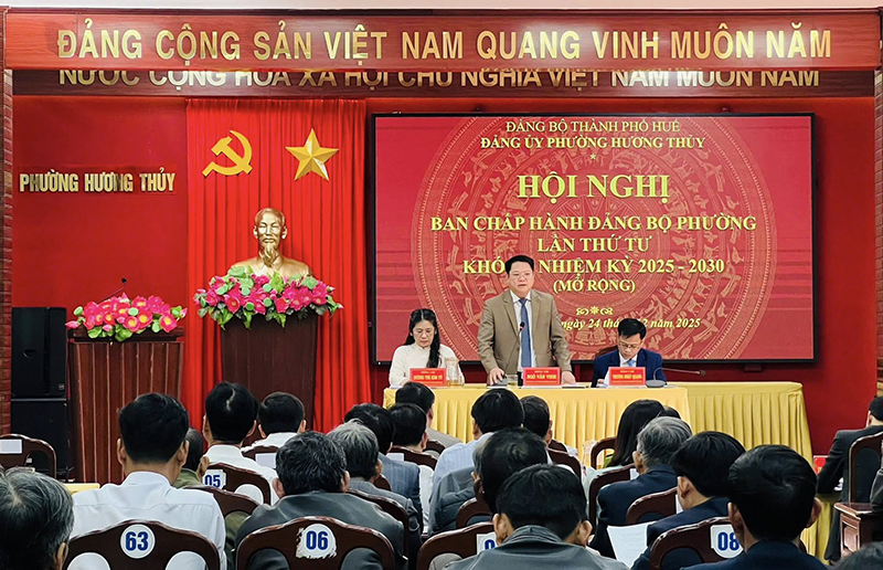 Ngày 24/12, Đảng ủy phường Hương Thủy tổ chức Hội nghị Ban Chấp hành Đảng bộ phường lần thứ tư mở rộng nhằm đánh giá kết quả lãnh đạo thực hiện nhiệm vụ năm 2025 và triển khai phương hướng, nhiệm vụ năm 2026. Chủ trì hội nghị có đồng chí Ngô Văn Vinh - Bí thư Đảng ủy, Chủ tịch HĐND; đồng chí Dương Thị Kim Tú - Phó Bí thư Thường trực Đảng ủy; đồng chí Trương Nhật Quang - Phó Bí thư Đảng ủy, Chủ tịch UBND; ...