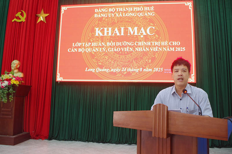 Nhằm nâng cao nhận thức về chính trị cho đội ngũ cán bộ quản lý, giáo viên góp phần thực hiện thắng lợi nhiệm vụ năm học 2025 - 2026, ngày 24/8, Đảng ủy xã Long Quảng tổ chức lớp bồi dưỡng chính trị hè năm 2025 cho gần 200 cán bộ quản lý, giáo viên các trường học trên địa bàn. Tham dự có đồng chí Nguyễn Thành Nhân, Phó Trưởng ban Tuyên giáo và Dân vận Thành ủy Huế; đồng chí Nguyễn Hữu Ánh, Phó Bí thư Thường trực Đảng ...