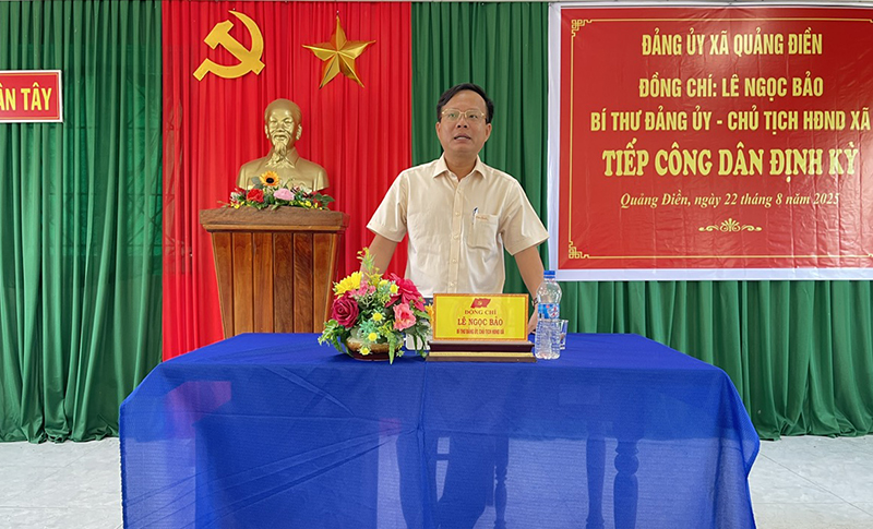 Ngày 22/8, đồng chí Bí thư Đảng ủy, Chủ tịch HĐND xã Quảng Điền, Lê Ngọc Bảo đã có buổi tiếp công dân định kỳ tại nhà văn hóa thôn An Xuân Tây. Cùng tham dự có đồng chí Hoàng Công Phóng - UVTV, Phó Chủ tịch HĐND xã; lãnh đạo Văn phòng Đảng ủy; ...