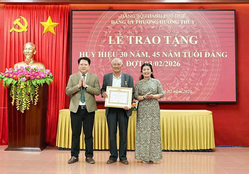 Ngày 02/02, Ban Thường vụ Đảng ủy phường Hương Thủy tổ chức Lễ trao tặng Huy hiệu 30, 45 năm tuổi Đảng đợt 07/11/2025 và đợt 03/02/2026 cho 5 đảng viên thuộc Đảng bộ phường.