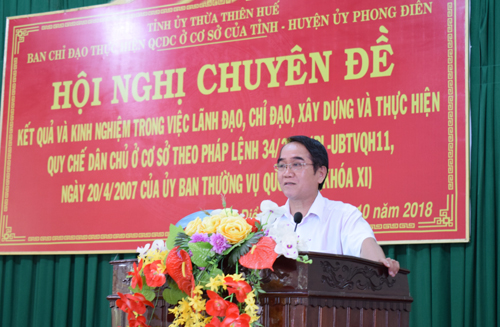 Sáng ngày 31/10/2018, Ban Chỉ đạo thực hiện Quy chế dân chủ ở cơ sở của tỉnh phối hợp với Huyện ủy Phong Điền tổ chức Hội nghị chuyên đề “kết quả và kinh nghiệm trong việc lãnh đạo, chỉ đạo, xây dựng và thực hiện QCDC ở cơ sở theo Pháp ...