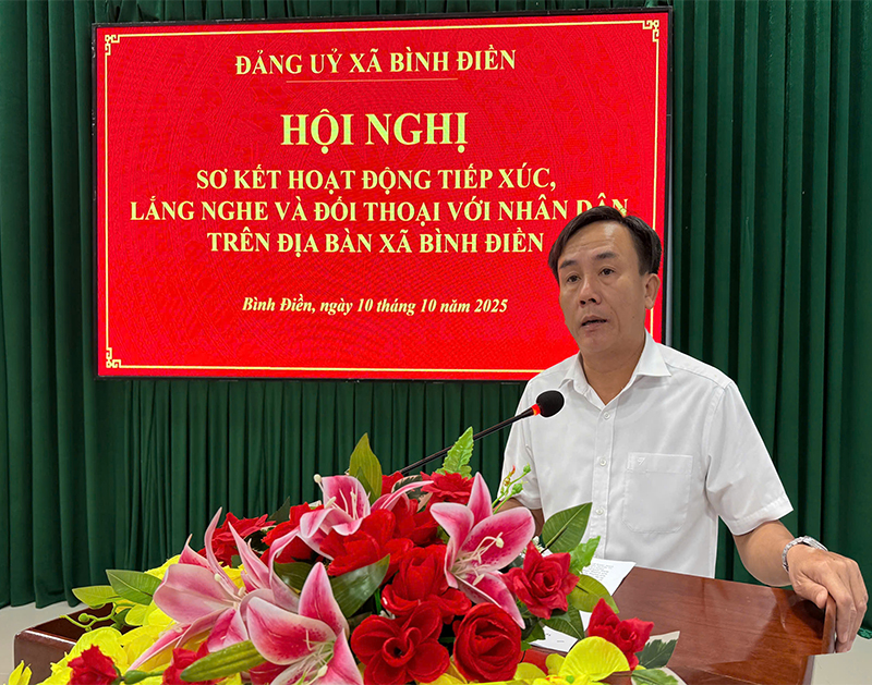 Ngày 10/10, Đảng ủy xã Bình Điền tổ chức Hội nghị sơ kết hoạt động tiếp xúc, lắng nghe và đối thoại với Nhân dân trên địa bàn xã trong thời gian qua. Tham dự và chủ trì Hội nghị có đồng chí Lê Nhật Minh – Bí thư Đảng uỷ, Chủ tịch Hội đồng nhân dân xã Bình Điền, đồng chí Nguyễn Tiến Giang – Phó Bí thư Thường trực Đảng ủy xã và đồng chí Trần Xuân Anh – Phó Bí thư Đảng ủy, Chủ tịch Ủy ban nhân dân xã; các ...