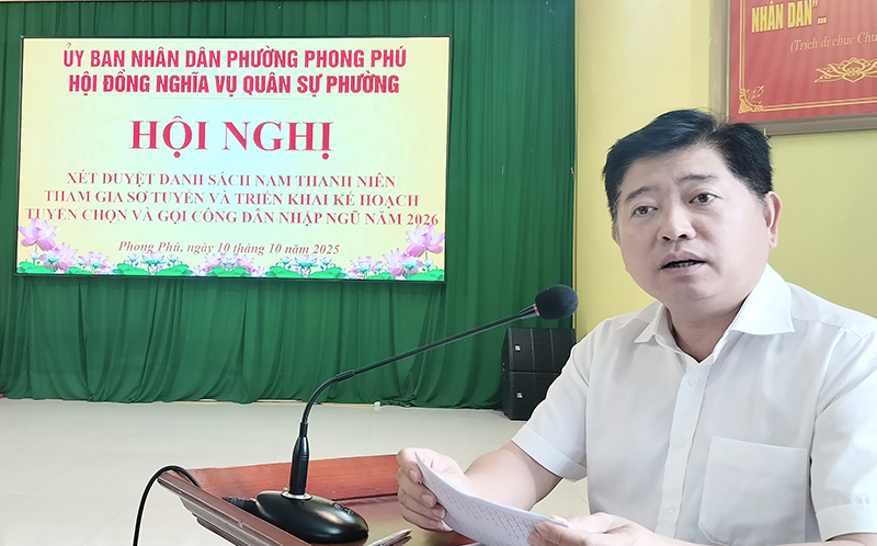 Sáng 10/10, Hội đồng Nghĩa vụ quân sự phường Phong Phú tổ chức Hội nghị xét duyệt danh sách nam thanh niên tham gia sơ tuyển và triển khai kế hoạch tuyển chọn và gọi công dân nhập ngũ năm 2026. Đồng chí Nguyễn Văn Dũng, Phó Bí thư Đảng ủy, Chủ tịch ...