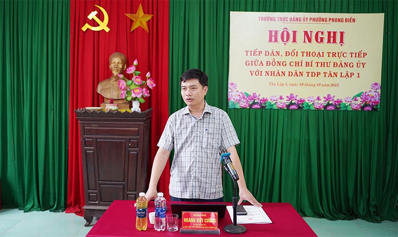 Sáng 10/10, đồng chí Hoàng Việt Cường, Bí thư Đảng uỷ, Chủ tịch HĐND phường Phong Điền đã có buổi tiếp dân, đối thoại trực tiếp với Nhân dân tổ dân phố Tân Lập 1. Cùng dự buổi tiếp có lãnh đạo Ban Xây dựng Đảng, UBKT Đảng ủy, UBMTTQVN phường; ...