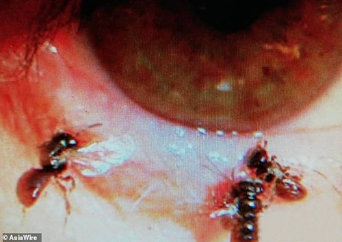 Kiểm tra bằng kính hiển vi, các bác sĩ ở Đại học Foooyin (Đài Loan) phát hiện bốn con ong còn sống trong mắt nữ bệnh nhân.