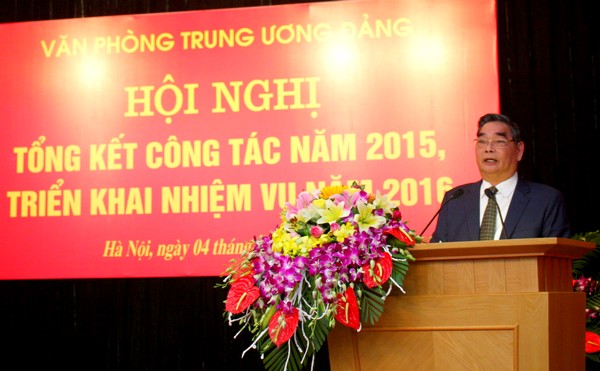 Sáng 4/1/2016, tại Hà Nội, Văn phòng Trung ương Đảng tổ chức Hội nghị tổng kết công tác năm 2015 và triển khai nhiệm vụ năm 2016. Đồng chí Lê Hồng Anh, Uỷ viên Bộ Chính trị, Thường trực Ban Bí thư dự và phát biểu chỉ đạo Hội nghị.