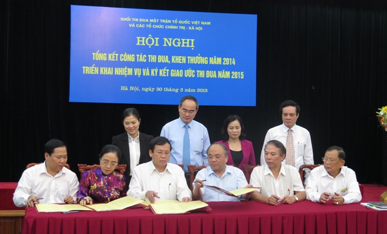 Chiều 30/3, tại Hà Nội, Khối thi đua Mặt trận Tổ quốc (MTTQ) Việt Nam và các tổ chức chính trị - xã hội tổ chức Hội nghị tổng kết công tác thi đua, khen thưởng năm 2014, triển khai nhiệm vụ và ký kết giao ước thi đua năm 2015.