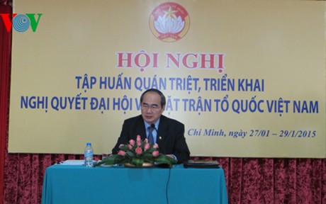 Sáng nay (27/1), tại thành phố Hồ Chí Minh, ông Nguyễn Thiện Nhân, Ủy viên Bộ Chính trị, Chủ tịch Ủy ban Trung ương Mặt trận Tổ quốc Việt Nam chủ trì Hội nghị tập huấn quán triệt, triển khai Nghị quyết Đại hội lần thứ 8 Mặt trận Tổ quốc Việt Nam (nhiệm kỳ 2014-2019) trong hệ thống Mặt trận từ Trung ương đến cơ sở.