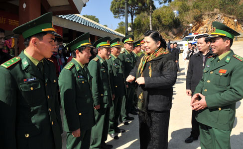 Bắt đầu chuyến công tác tại Hà Giang, sáng 14.1, Ủy viên Bộ Chính trị, Phó chủ tịch QH Tòng Thị Phóng đã đến thăm và tặng quà cán bộ, chiến sĩ Đồn Biên phòng Lũng Cú.