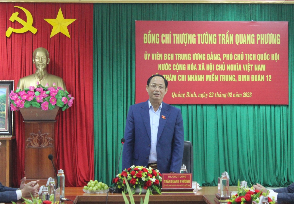 Chiều 22/2, Thượng tướng Trần Quang Phương, Phó Chủ tịch Quốc hội đã đến thăm và làm việc tại Binh đoàn 12 - Tổng Công ty xây dựng Trường Sơn - Chi nhánh Miền Trung đóng tại tỉnh Quảng Bình.