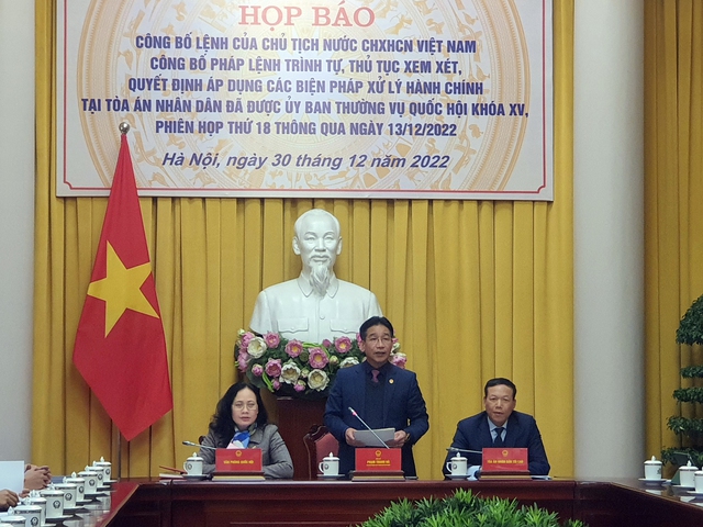 Chiều 30/12, tại Phủ Chủ tịch, Văn phòng Chủ tịch nước tổ chức họp báo công bố Lệnh của Chủ tịch nước đối với Pháp lệnh Trình tự, thủ tục xem xét, quyết định áp dụng các biện pháp xử lý hành chính tại Tòa án nhân dân Tối cao (TANDTC).