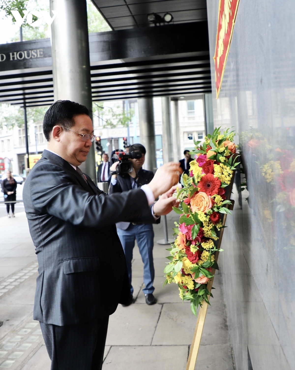 Trong khuôn khổ chuyến thăm chính thức Vương quốc Anh, sáng 29/6, Chủ tịch Quốc hội Vương Đình Huệ và Đoàn đại biểu cấp cao Quốc hội Việt Nam đến đặt hoa tại Biển tưởng niệm Bác Hồ, tại Tòa nhà New Zealand, trên phố Hay Market ở Thủ đô London.