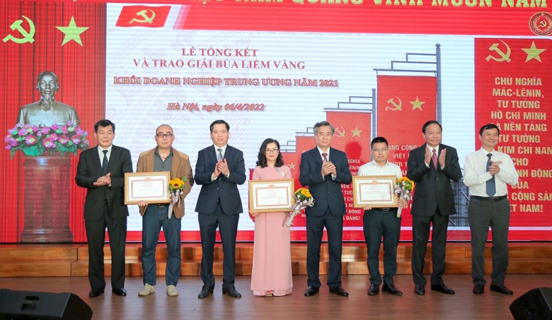 Ban Tổ chức Giải Búa liềm vàng Khối Doanh nghiệp Trung ương năm 2021 đã trao 3 giải Nhất, 3 giải Nhì, 8 giải Ba, 15 giải Khuyến khích cho các tác giả, nhóm tác giả, đồng thời, khen thưởng 2 đảng ủy trực thuộc có thành tích xuất sắc và 4 đảng ủy trực ...
