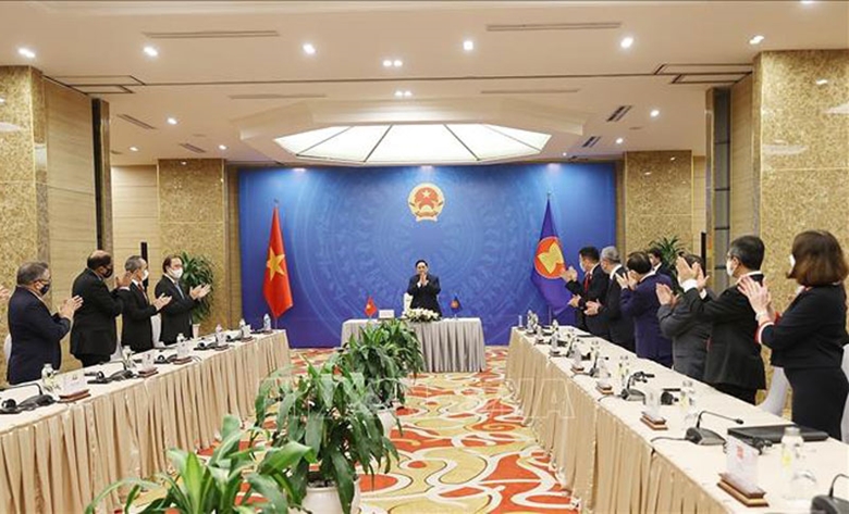 Thủ tướng Phạm Minh Chính bày tỏ vui mừng gặp lại các Đại sứ, Đại biện sau thời gian dài giãn cách do dịch bệnh, đồng thời cảm ơn các Đại sứ, Đại biện đã cảm thông và chia sẻ cùng Việt Nam trải qua giai đoạn khó khăn do dịch bệnh. Nhân dịp này, Thủ tướng cảm ơn các nước đã hỗ trợ Việt Nam trong chống dịch COVID-19.