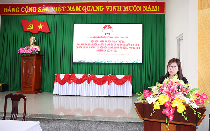 Chiều 09/02, Ủy ban Mặt trận Tổ quốc Việt Nam (UBMTTQVN) phường Phong Phú tổ chức Hội nghị Hiệp thương lần thứ ba thỏa thuận, lựa chọn và lập danh sách những người đủ tiêu chuẩn ứng cử đại biểu HĐND phường, nhiệm kỳ 2026 - 2031. Bà Lê Thị Hoa ...