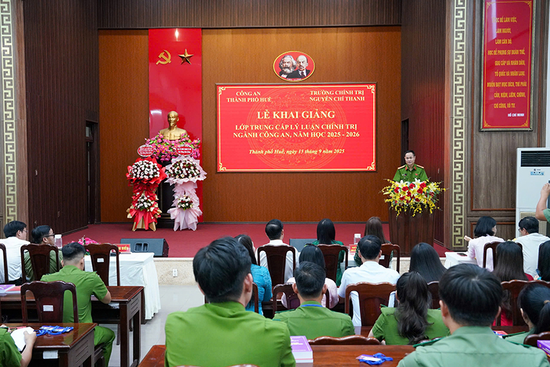 Vừa qua, Công an thành phố Huế phối hợp với Trường Chính trị Nguyễn Chí Thanh vừa tổ chức Lễ khai giảng lớp Trung cấp lý luận chính trị hệ tập trung. Tham dự buổi lễ có đồng chí Đại tá Kiều Đức Tính, Phó Giám đốc Công an thành phố, lãnh đạo Trường Chính trị Nguyễn Chí Thanh