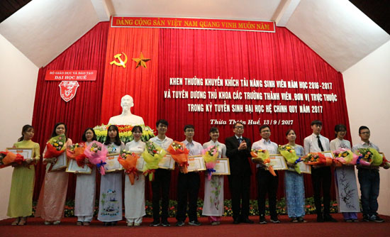 Sáng ngày 13/9, Đại học Huế tổ chức khen thưởng các sinh viên tài năng, đạt giải cao trong các cuộc thi năm học 2016 - 2017 và các sinh viên đỗ thủ khoa năm 2017.