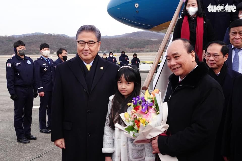 Đón Chủ tịch nước Nguyễn Xuân Phúc và Đoàn tại sân bay có Bộ trưởng Ngoại giao Park Jin, Đại sứ Hàn Quốc tại Việt Nam Oh Young-ju và một số quan chức ngoại giao Hàn Quốc.