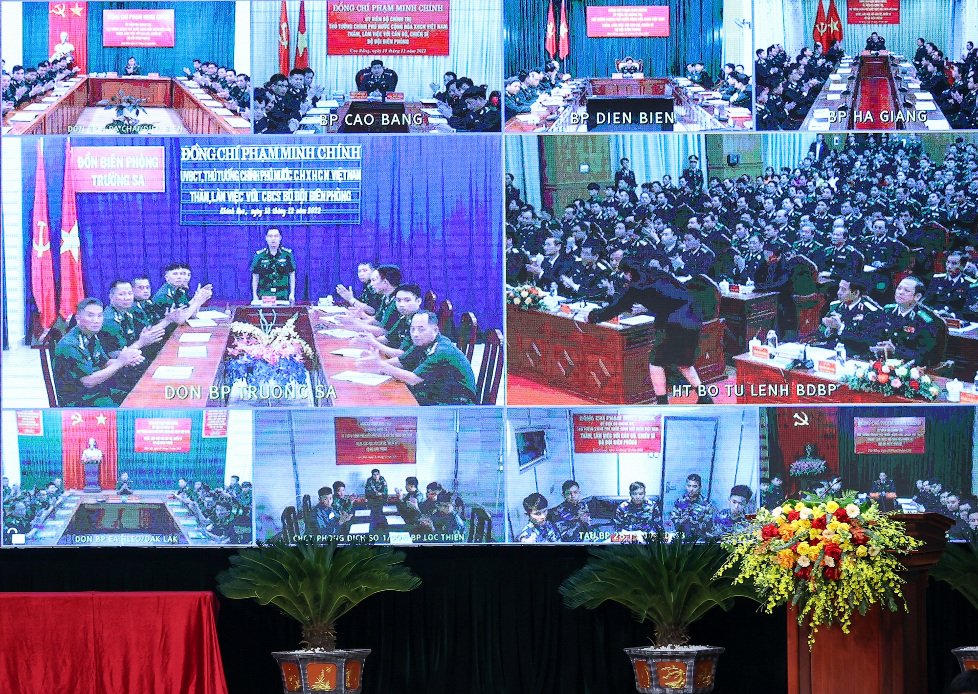 Thủ tướng thăm hỏi, động viên, nói chuyện thân mật với cán bộ, chiến sĩ cơ quan Bộ Tư lệnh cùng với một số điểm cầu tại Đồn biên phòng A Pa Chải, tỉnh Điện Biên; Đồn Biên phòng Trường Sa, tỉnh Khánh Hòa; Đồn Biên phòng Ea Hleo, tỉnh Đắk Lắk - Ảnh: VGP/Nhật Bắc