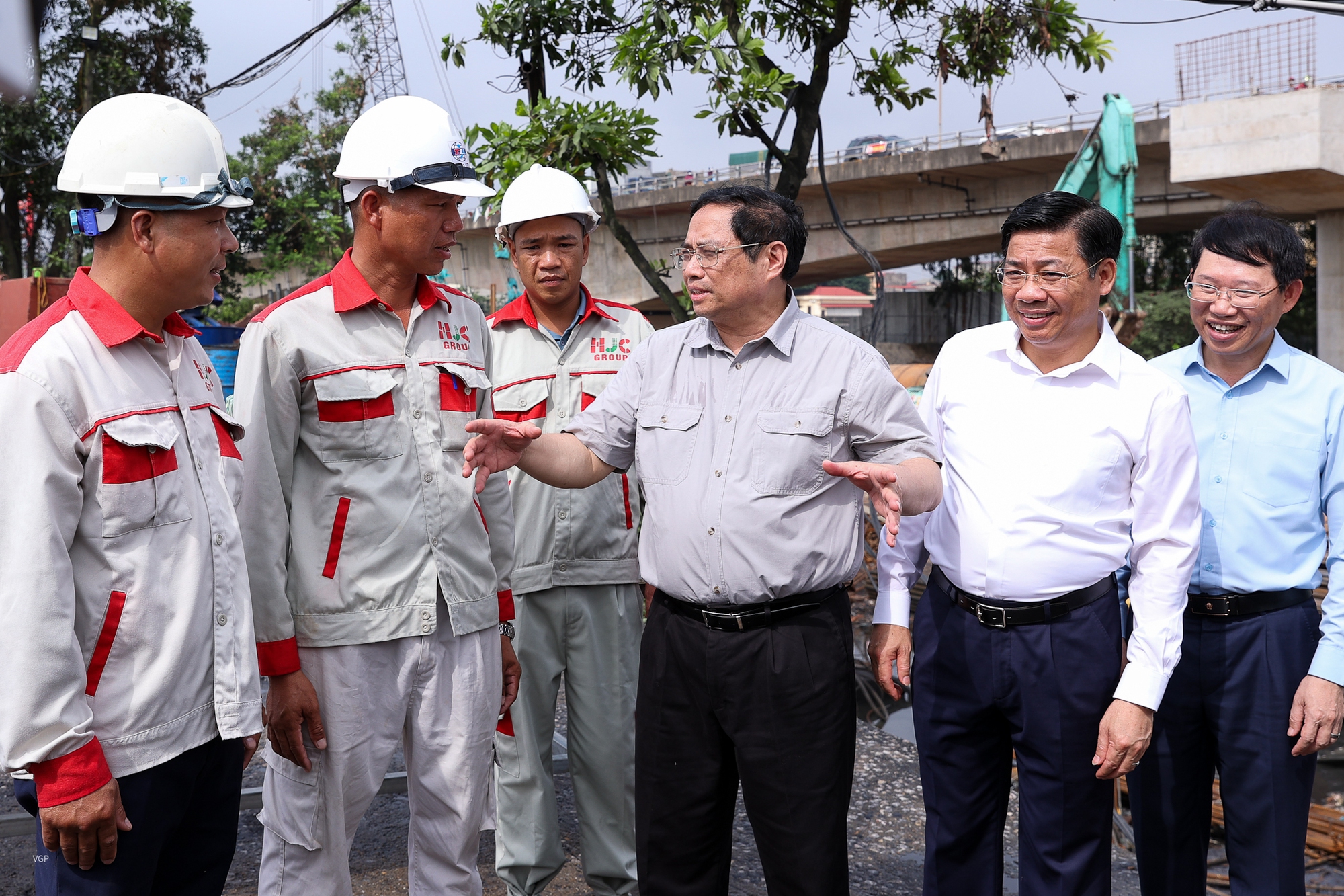 Thủ tướng trao đổi với công nhân thi công cầu Như Nguyệt - Ảnh VGP/Nhật Bắc