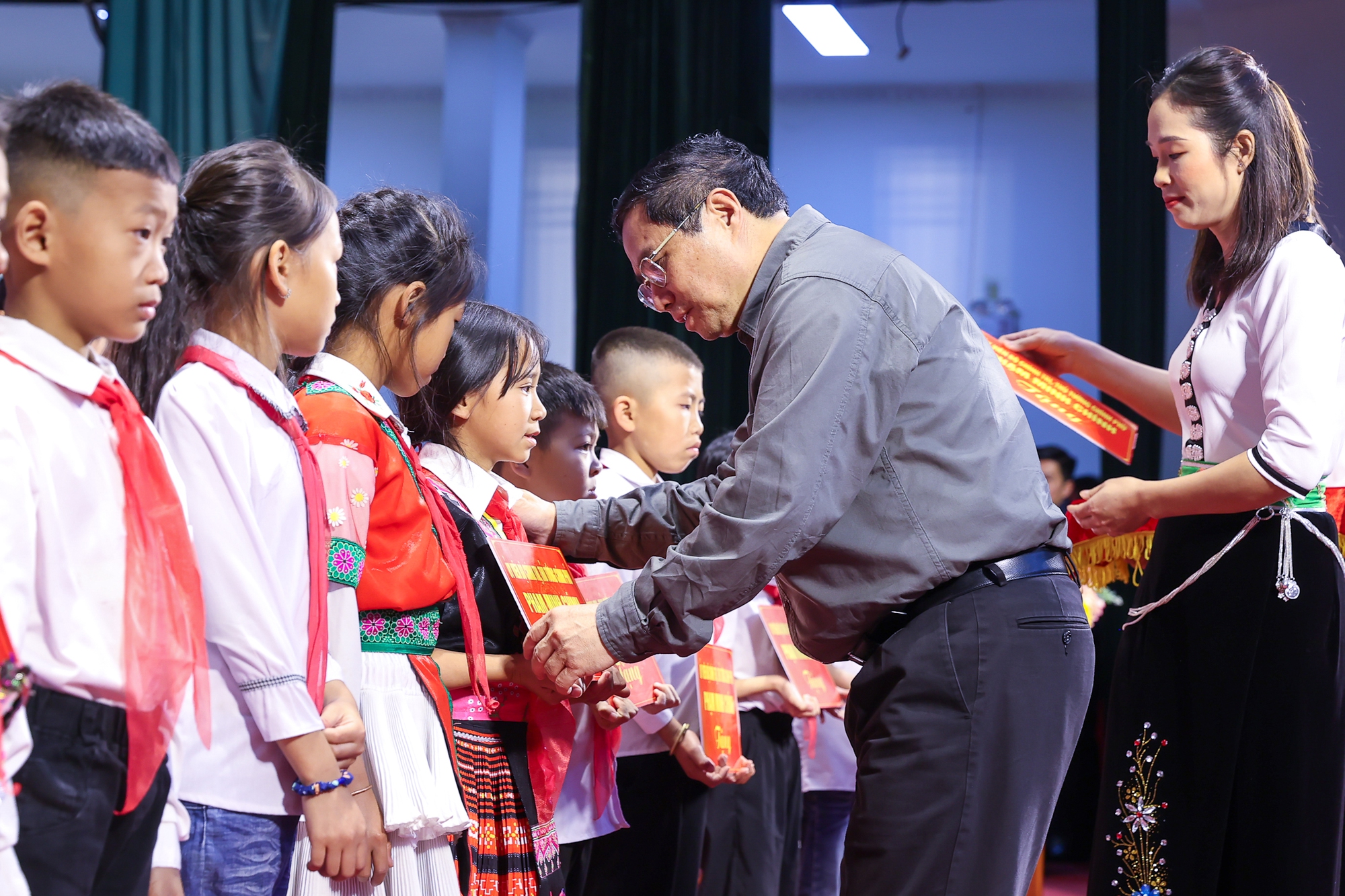 Thủ tướng biểu dương, đánh giá cao nỗ lực của các bộ, ngành, địa phương, đặc biệt là Bộ GD&ĐT, tỉnh Điện Biên trong nỗ lực thực hiện sự nghiệp bảo vệ, chăm sóc, giáo dục trẻ em nói chung và việc tổ chức Chương trình trao học bổng, tặng quà tại Điện Biên nói riêng - Ảnh: VGP/Nhật Bắc