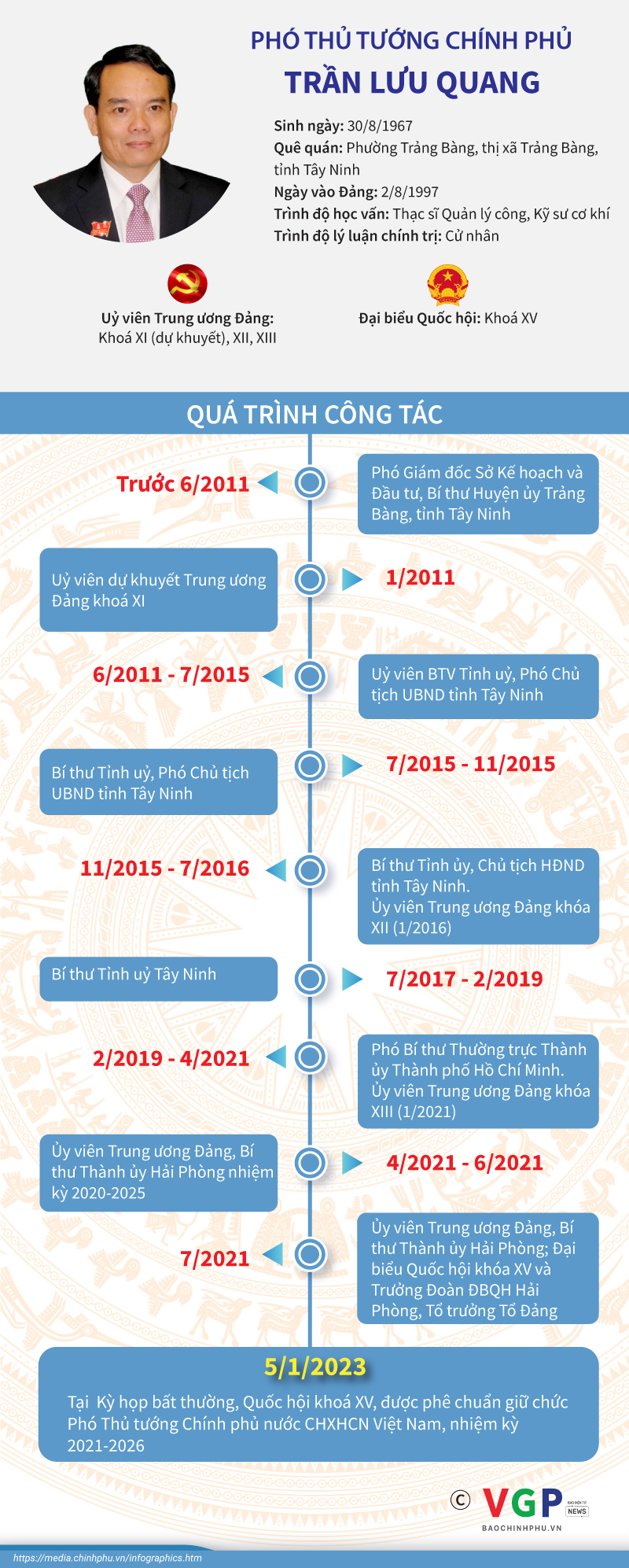 Ngày 5/1/2023, tại Kỳ họp bất thường lần thứ 2 - Quốc hội khóa XV, đồng chí Trần Lưu Quang được Quốc hội phê chuẩn bổ nhiệm chức vụ Phó Thủ tướng Chính phủ./.