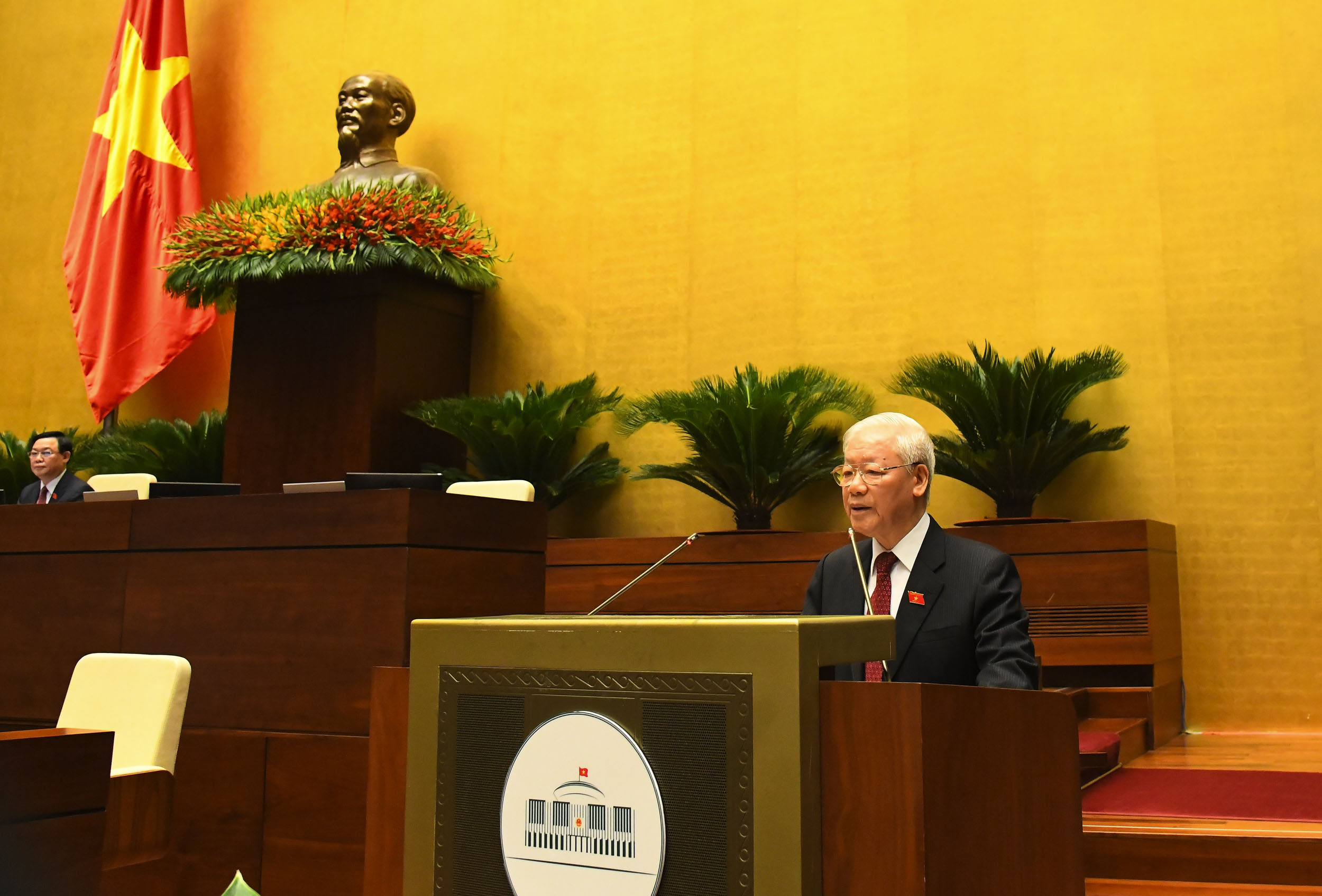 Tổng Bí thư Nguyễn Phú Trọng khẳng định, trước mắt, cần tập trung làm tốt công tác thể chế hoá, cụ thể hoá các quyết sách quan trọng được khẳng định tại Đại hội đại biểu toàn quốc lần thứ XIII của Đảng, chuẩn bị về mọi mặt, bảo đảm cho hoạt động của Quốc hội khoá XV có nhiều khởi sắc và đạt chất lượng ngày càng cao, đáp ứng được những yêu cầu, nhiệm vụ của cách mạng, và tâm tư, nguyện vọng của nhân dân trong giai đoạn mới. Muốn thế, một vấn đề hết sức quan trọng, có ý nghĩa quyết định tôi muốn nhấn mạnh thêm là, tất cả các vị đại biểu Quốc hội chúng ta khoá này cần tiếp tục nêu cao tinh thần trách nhiệm, hết lòng vì nước, vì dân, phụng sự Tổ quốc, phục vụ nhân dân, thường xuyên tu dưỡng, rèn luyện, giữ gìn phẩm chất, đạo đức, nâng cao trình độ về mọi mặt, gần gũi và lắng nghe ý kiến của nhân dân, thực hiện và hoàn thành tốt nhất nhiệm vụ mà cử tri và nhân dân giao phó.