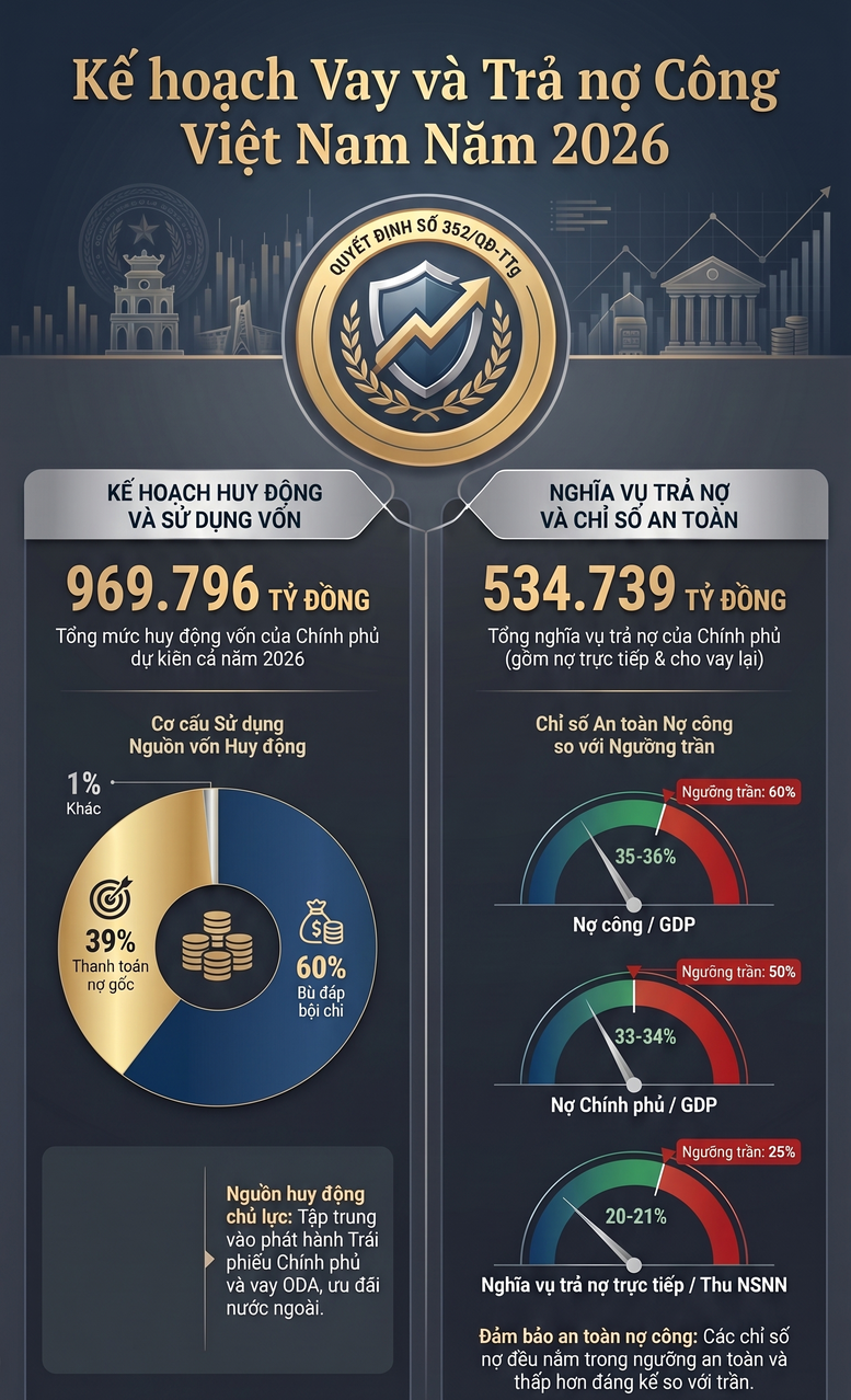 Theo thông tin Bộ Tài chính công bố ngày 22/4/2026, Kế hoạch quản lý và trả nợ công năm 2026 của Việt Nam đặt trọng tâm vào việc huy động nguồn lực lớn cho đầu tư hạ tầng, đồng thời vẫn đảm bảo các chỉ tiêu an toàn nợ công. Tổng mức huy động vốn của Chính phủ dự kiến đạt 969.796 tỷ đồng, trong đó khoảng 60% (583.700 tỷ đồng) dùng để bù đắp bội chi ngân sách và 39% (376.005 tỷ đồng) dành cho trả nợ gốc.