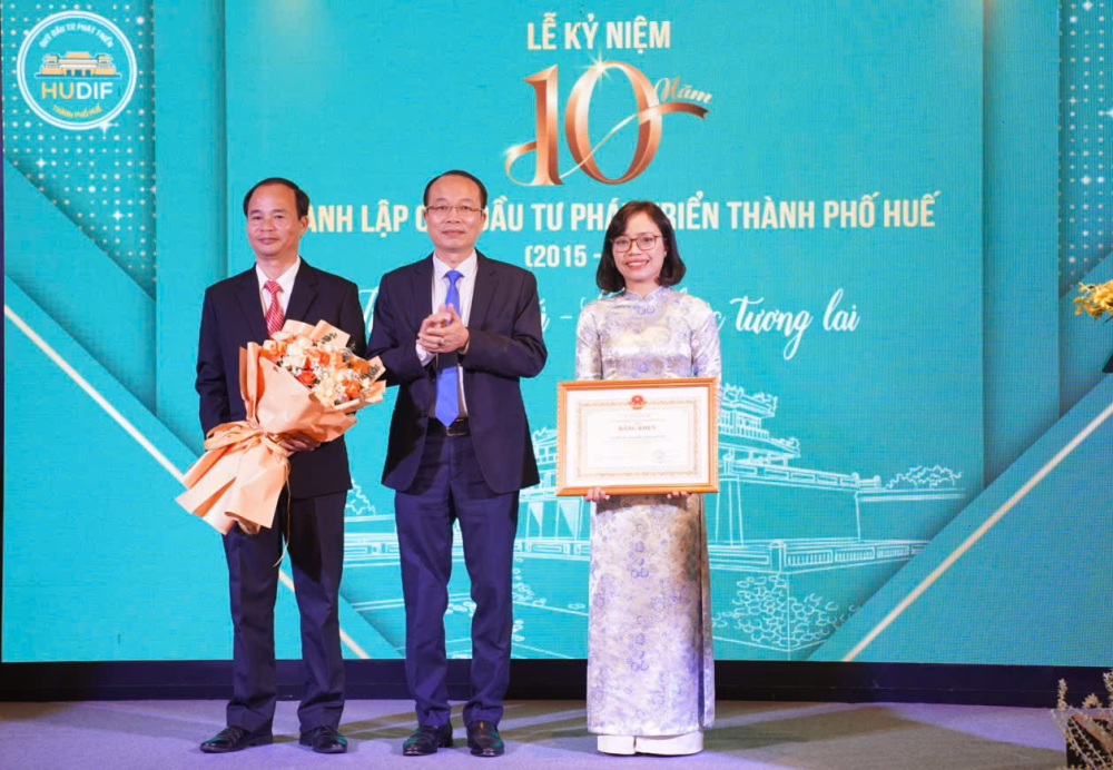 Dịp này, Phó Chủ tịch UBND thành phố Phan Quý Phương trao bằng khen của Chủ tịch UBND thành phố Huế cho Quỹ Đầu tư phát triển thành phố Huế (Ảnh dưới)