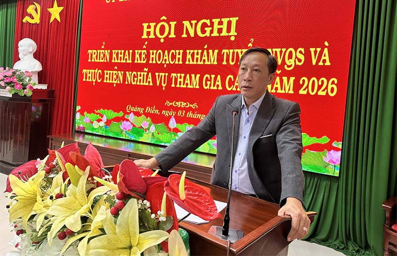 Ngày 3/12, Hội động nghĩa vụ quân sự xã Quảng Điền tổ chức hội nghị phát lệnh khám, tuyển công dân thực hiện nghĩa vụ quân sự và Công an nhân dân năm 2026. Đồng chí Nguyễn Ánh Cầu - Phó Bí thư, Chủ tịch UBND xã, Chủ tịch HĐNV quân sự xã chủ trì ...