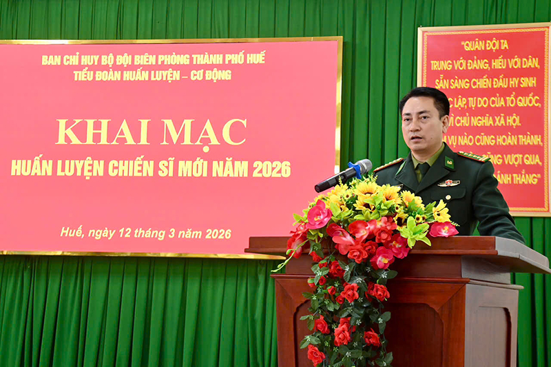 Ngày 12/3, Ban Chỉ huy Bộ đội Biên phòng thành phố Huế tổ chức khai mạc huấn luyện chiến sĩ mới năm 2026. Đại tá Hoàng Minh Hùng, Chỉ huy trưởng Ban Chỉ huy Bộ đội Biên phòng thành phố Huế dự và phát biểu chỉ đạo.