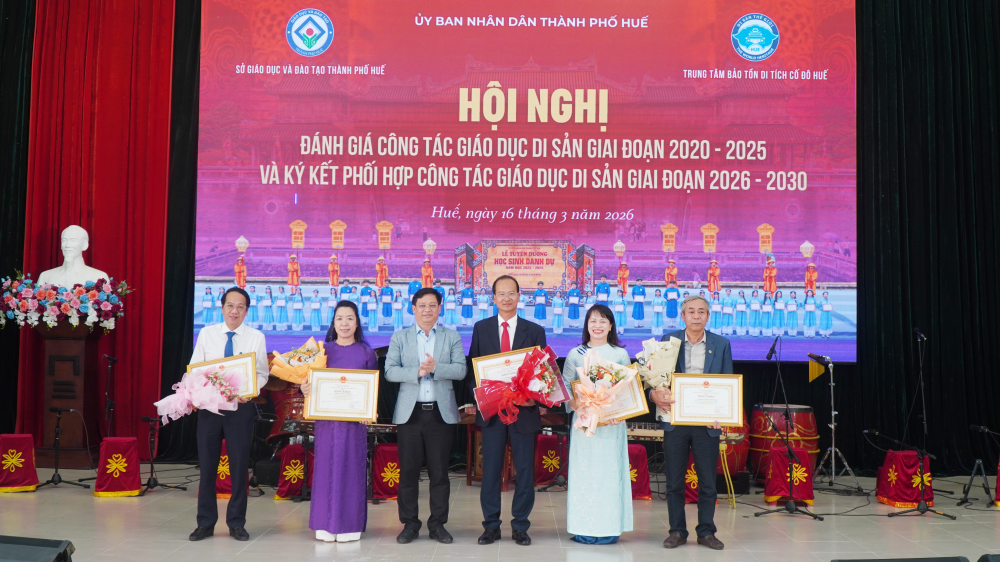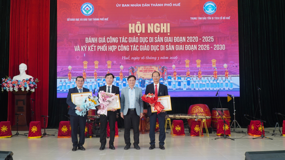 Dịp này, UBND thành phố đã trao tặng Bằng khen cho 03 tập thể và 05 cá nhân đã có thành tích xuất sắc trong công tác giáo dục di sản giai đoạn 2020–2025. (ảnh dưới)