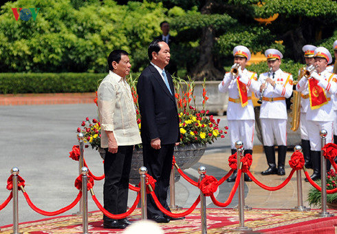 Chủ tịch nước Trần Đại Quang nhiệt liệt chào mừng ngài Rodrigo Duterte lần đầu tiên tới thăm chính thức Việt Nam trên cương vị Tổng thống Philippines; đánh giá cao ý nghĩa của chuyến thăm nhân dịp hai nước đang kỷ niệm 40 năm thiết lập quan hệ ngoại giao; tin tưởng rằng chuyến thăm của ngài Tổng thống sẽ góp phần quan trọng vào việc củng cố và đẩy mạnh hơn nữa quan hệ Đối tác chiến lược giữa hai nước trong giai đoạn mới.