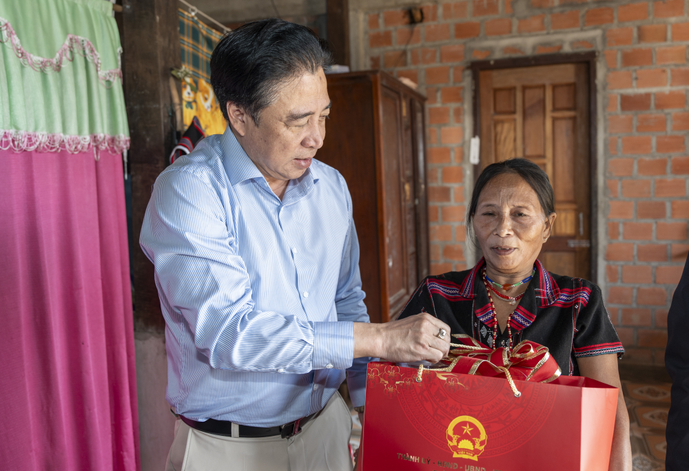 Chủ tịch UBND thành phố Nguyễn Khắc Toàn trao quà Tết cho hộ thoát nghèo tiêu biểu tại xã Long Quảng, động viên gia đình tiếp tục vươn lên ổn định cuộc sống