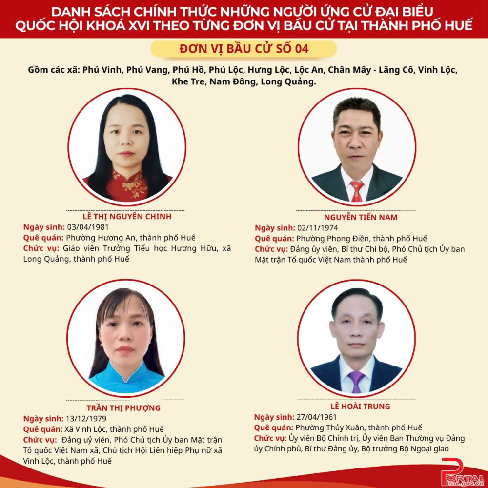 Theo Nghị quyết số 151/NQ-HĐBCQG của Hội đồng Bầu cử quốc gia, danh sách chính thức những người ứng cử đại biểu Quốc hội (ĐBQH) khóa XVI theo từng đơn vị bầu cử trong cả nước đã được công bố. Thành phố Huế được chia thành 4 đơn vị bầu cử; số ĐBQH được bầu là 9, số người ứng cử là 17 người. Trong đó, đơn vị bầu cử số 1, 3 và 4 mỗi đơn vị bầu 2 đại biểu (4 ứng cử viên); đơn vị bầu cử số 2 bầu 3 đại biểu (5 ứng cử viên). Theo dõi danh sách cụ thể phía bên dưới: