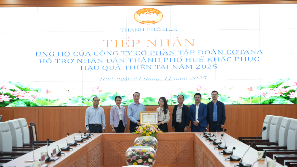 Dịp này, UBND thành phố Huế đã trao tặng Bằng khen của Chủ tịch UBND thành phố cho Công ty CP Tập đoàn Cotana nhằm ghi nhận nghĩa cử cao đẹp, tinh thần sẻ chia và những đóng góp thiết thực trong việc ủng hộ, hỗ trợ nhân dân thành phố Huế khắc phục khó khăn do mưa lũ gây ra.